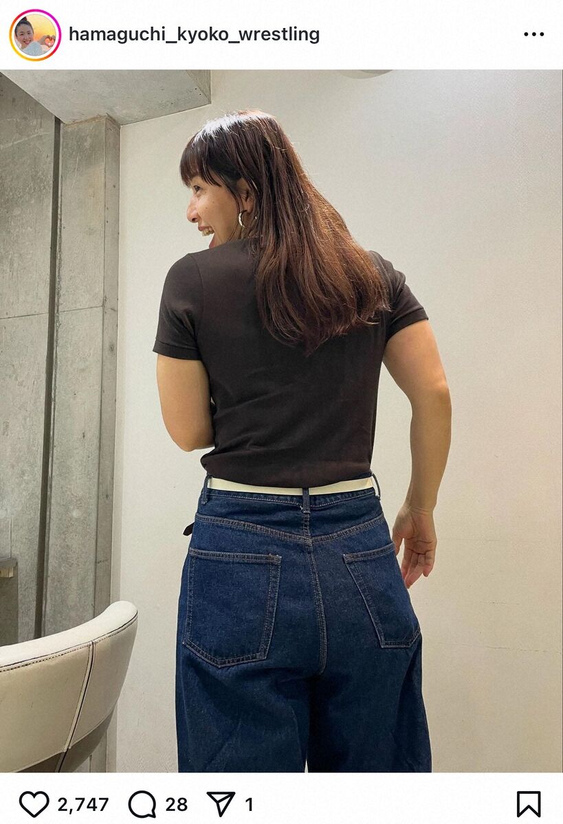 デニムのパンツに*のチビTというシンプルなコーデの浜口。少し横を向いたバックショットという普段はあまり見ることがないアングルだからなのか、とても女子力が高い感じがする。