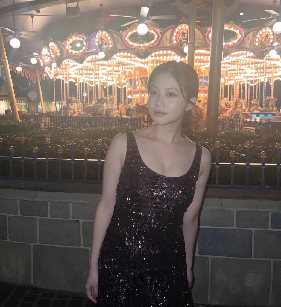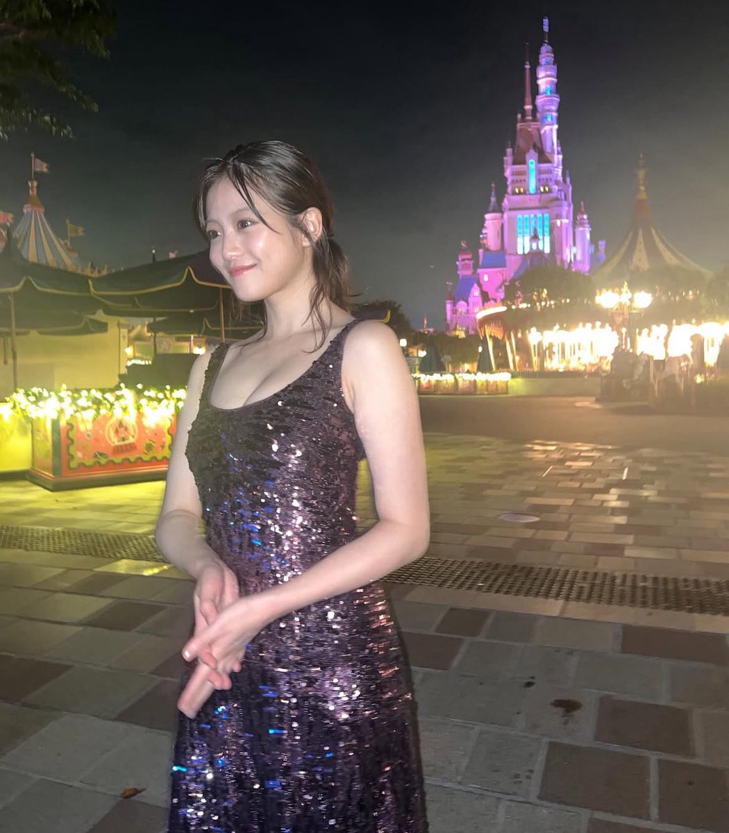 今田は、夜のディズニーリゾートでのショットを複数枚投稿。ライトアップされたお城を背景に、デコルテの美しさが際立つ胸元の開いたきらびやかなドレス姿を披露している。